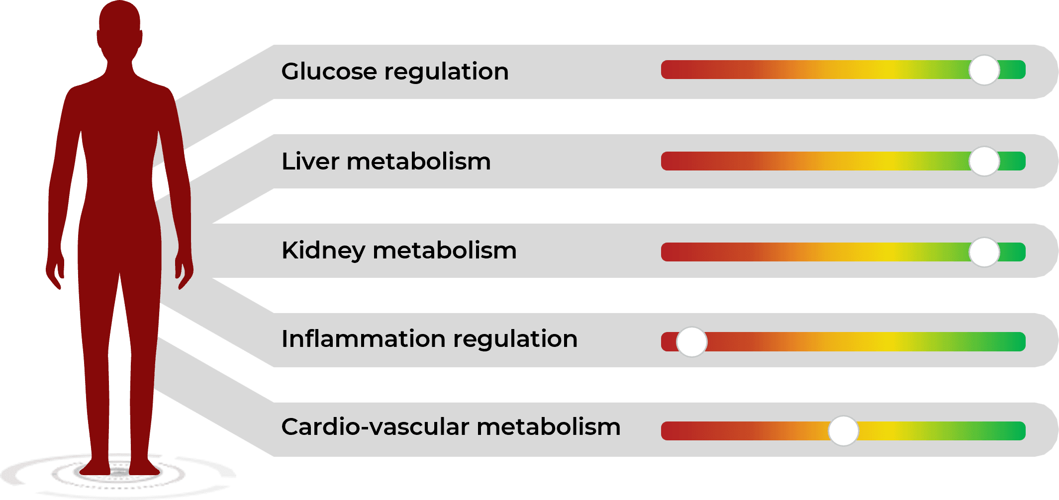 Your metabolism is assessed along 5 areas: glucose regulation, liver metabolism, kidney metabolism, inflammation regulation and cardiovascular metabolism.