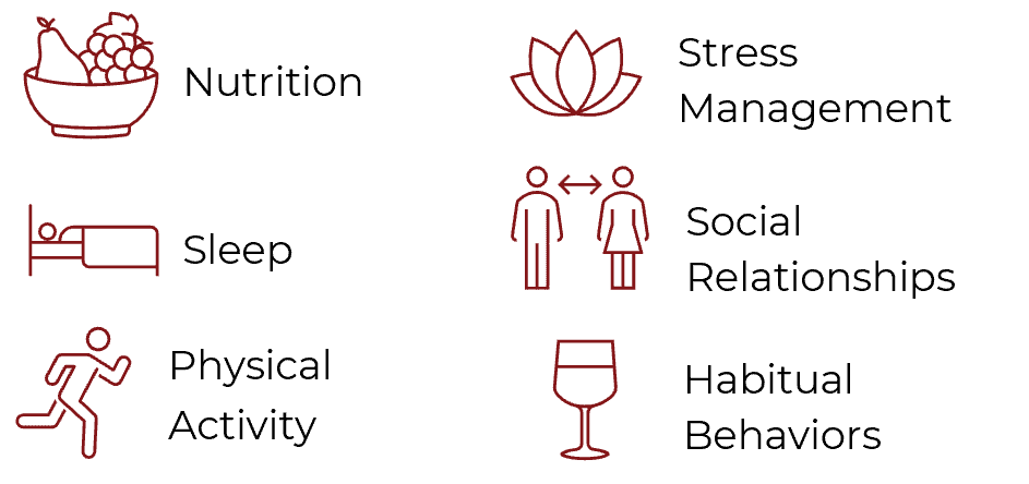 Actionable recommendations following the 6 pillars of lifestyle medicine: nutrition, physical activity, stress management, social connections and habitual behaviors with negative effects.