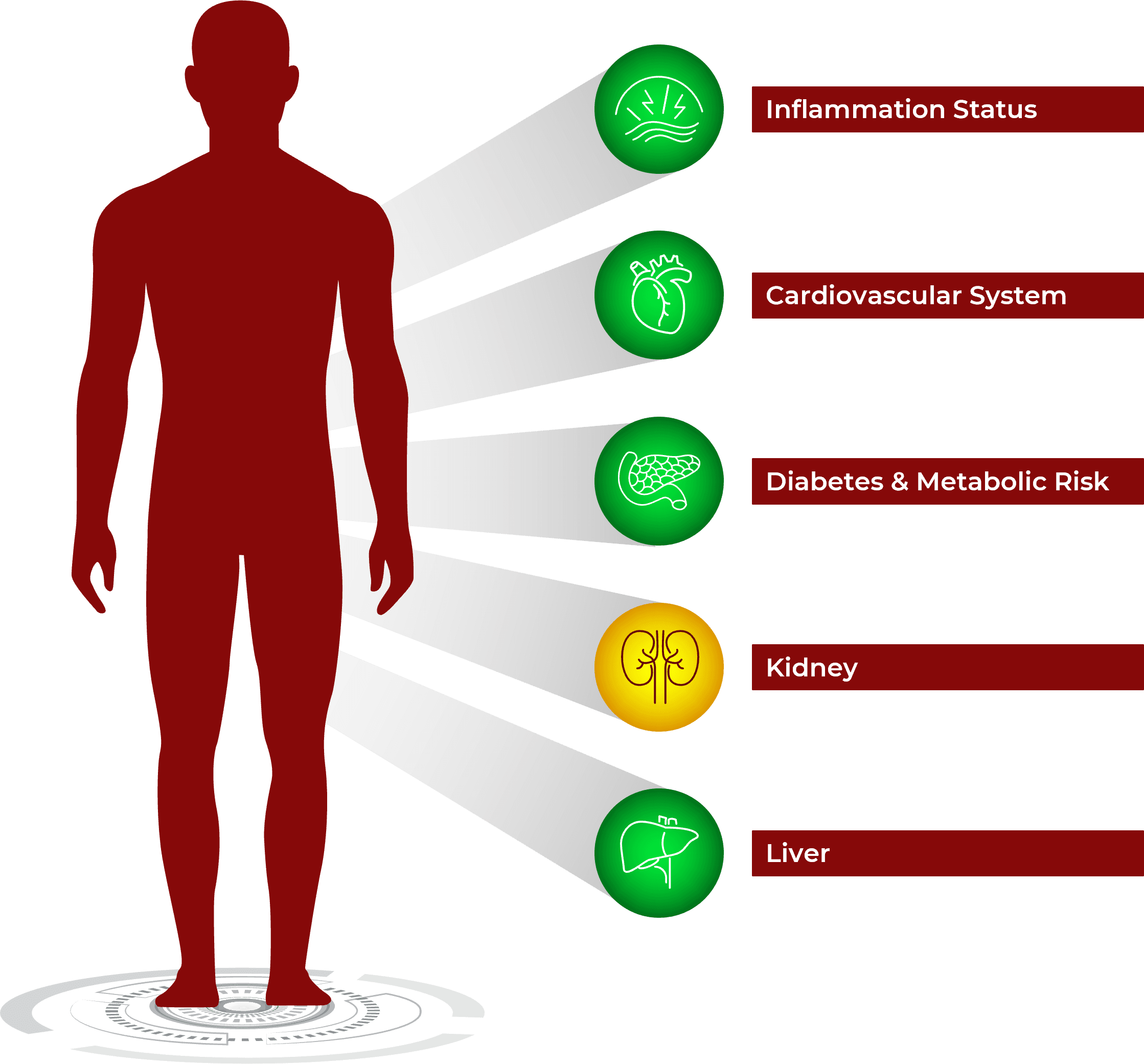 The easy option to check the metabolomic status — MetaboLIGHT enables room-temperature shipment, making it ideal for convenient self-collection from capillary blood. The report is based on 19 biomarkers (metabolites and lipoproteins) covering the same clusters as the MetaboPRO. MetaboLIGHT is the easy option for individual monitoring.